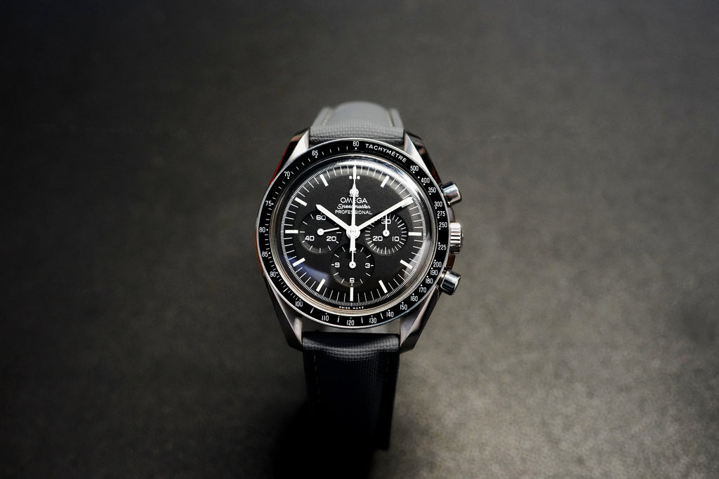 The deployant clasp rubber strap is detailed with cream contrast stitching and a sailcloth pattern. Created with FKM rubber, its soft characteristics delivers immediate comfort without needing a break-in period. The quick release spring bars allow for easy and convenient strap changes.