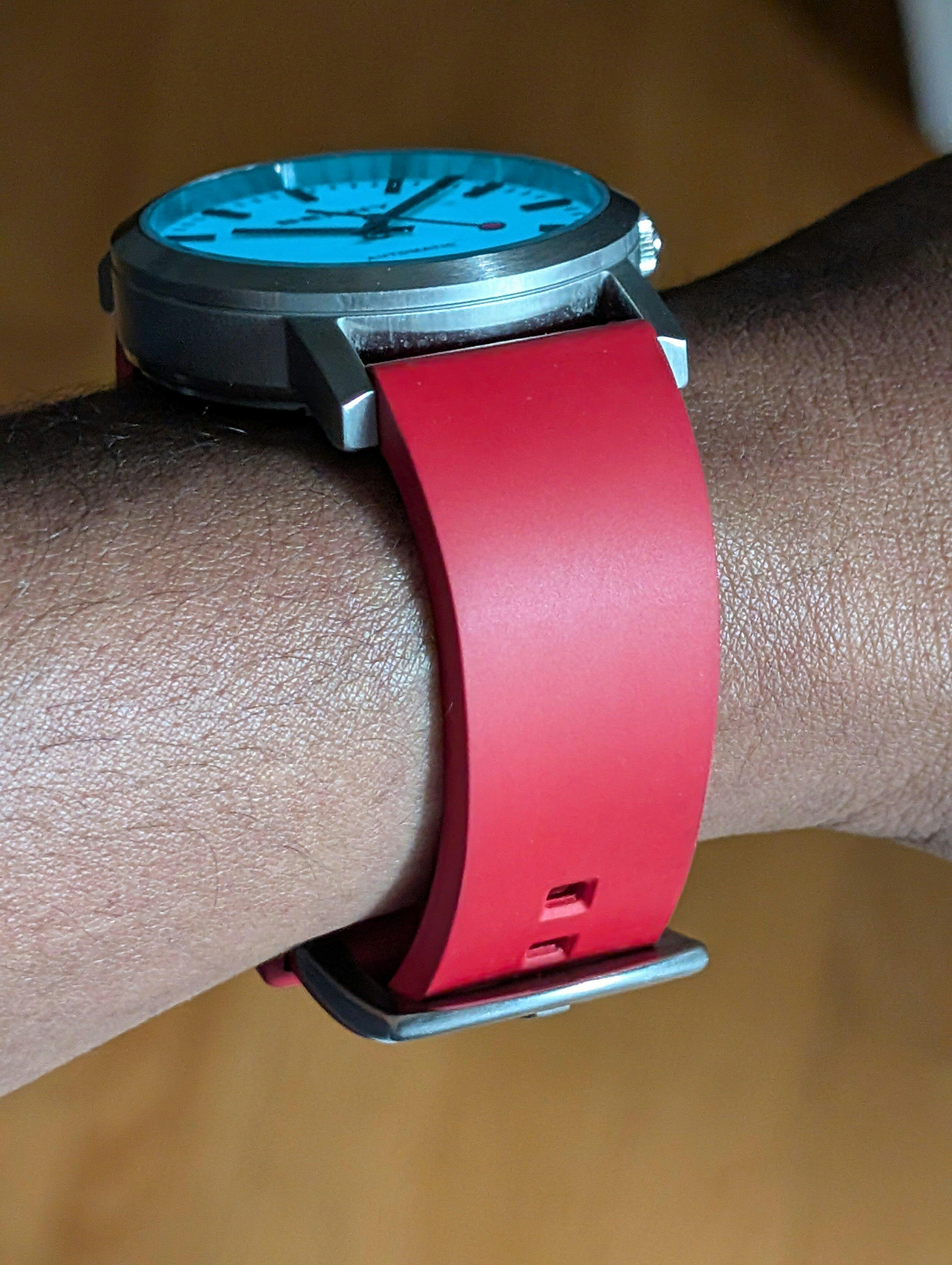 This strap is made out of vulcanised rubber, which makes it extremely soft and and durable. Another feature of the vulcanised rubber material is that it does not attract dust. As for the design, the strap has ridges on the underside for your wrist to breathe!
