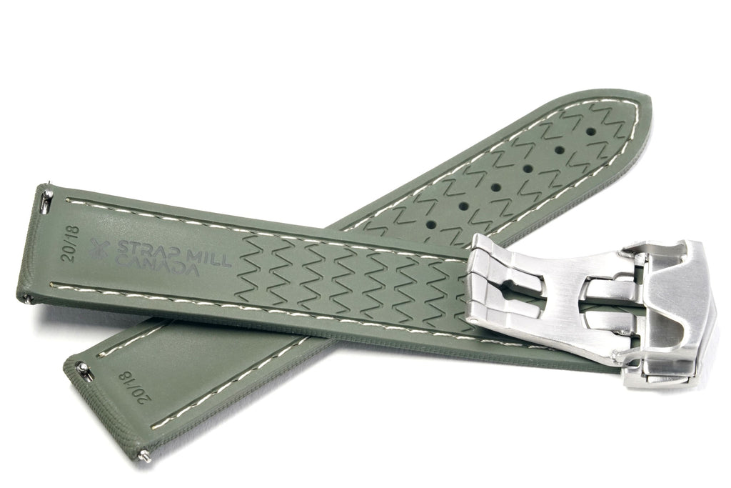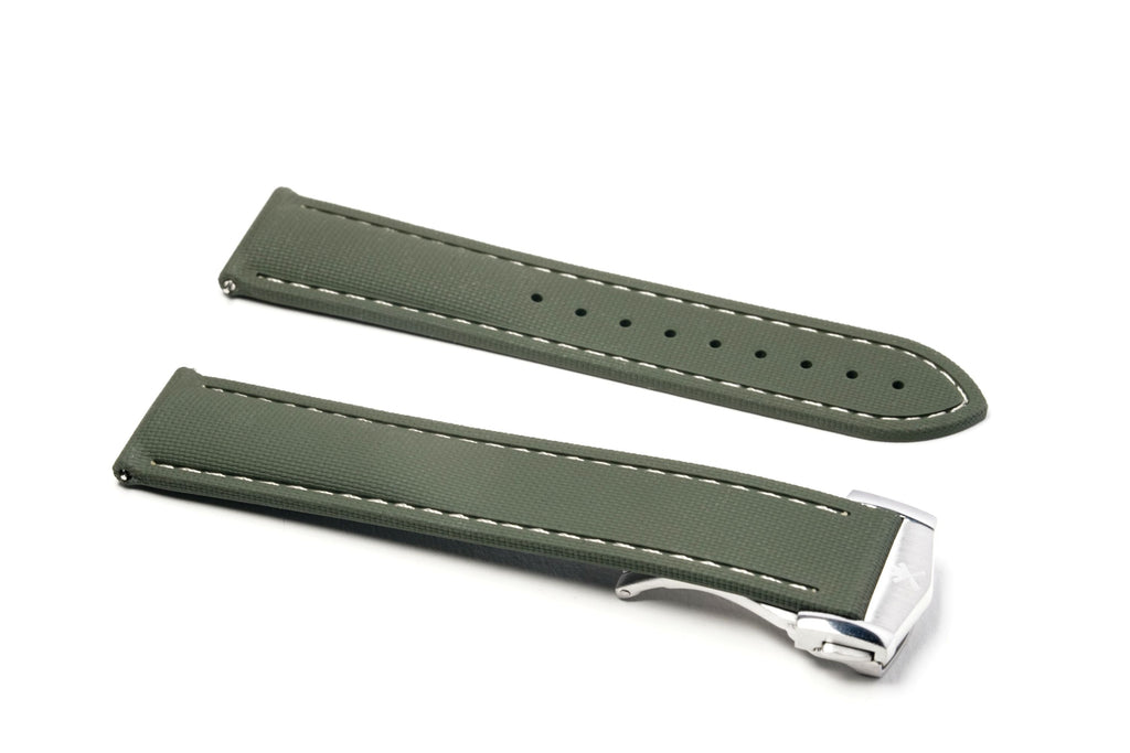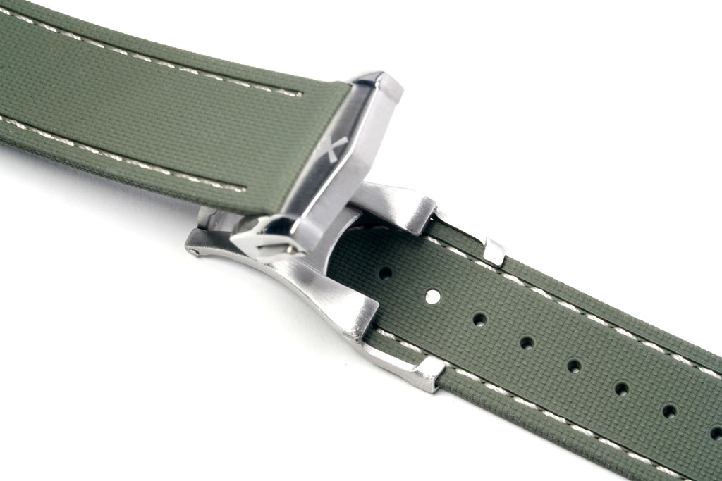 The deployant clasp rubber strap is detailed with cream contrast stitching and a sailcloth pattern. Created with FKM rubber, its soft characteristics delivers immediate comfort without needing a break-in period. The quick release spring bars allow for easy and convenient strap changes.